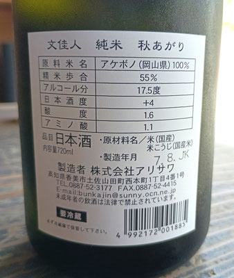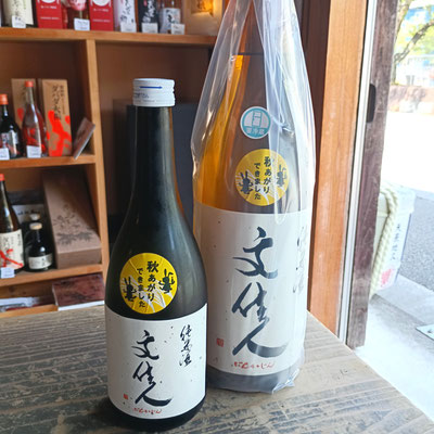 文佳人 純米酒 秋あがり 720ミリ ¥1.595 1.8リットル ¥3.190(税込み)
